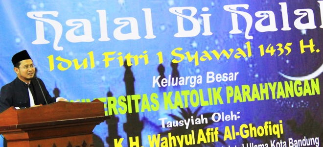 Dalam rangka memperingati Idul Fitri 1 Syawal 1435 H, Keluarga Besar Universitas Katolik Parahyangan pada tanggal 7 Agustus 2014 melaksanakan kegiatan Halal Bi Halal yang bertempat di Aula Fakultas Ekonomi Universitas Katolik Parahyangan. Dalam kegiatan ini Tausiyah disampaikan oleh K.H Wahyu Afif Al-Ghofiqi (Wakil Sekretaris Pengurus Cabang Nahdlatul Ulama Kota Bandung). Beliau menyampaikan bahwa pentingnya umat untuk selalu berbuat baik, berbagi kasih sayang, memaafkan orang lain dan menjadi panutan bagi umat lainnya.
